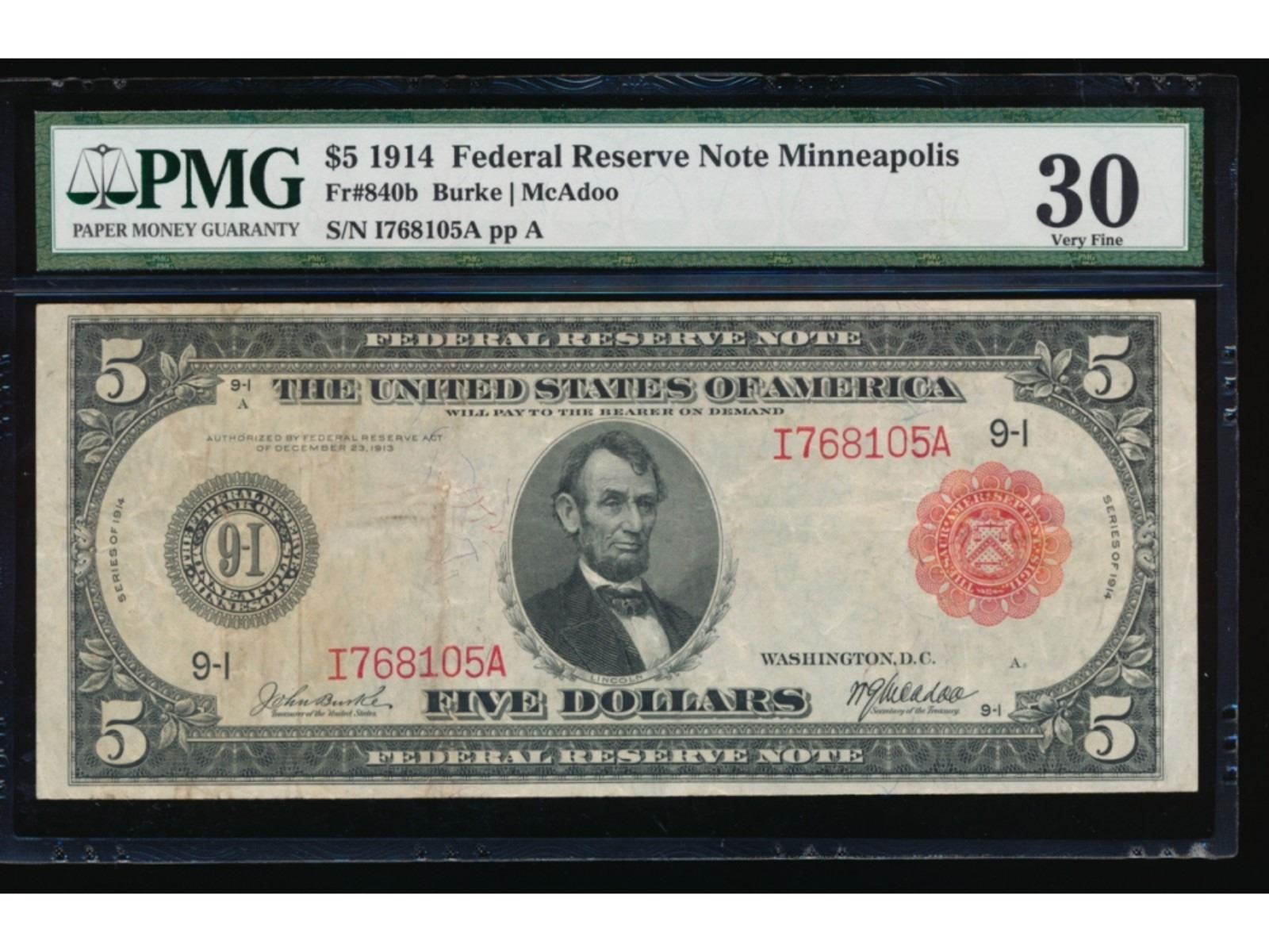 One 1914 $5 Minneapolis Red Seal Federal Reserve Note PMG 30.