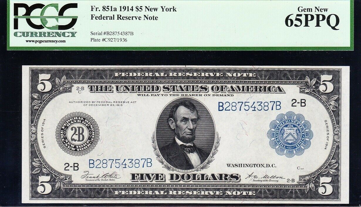 One 1914 $5 New York FRN PCGS 65PPQ.