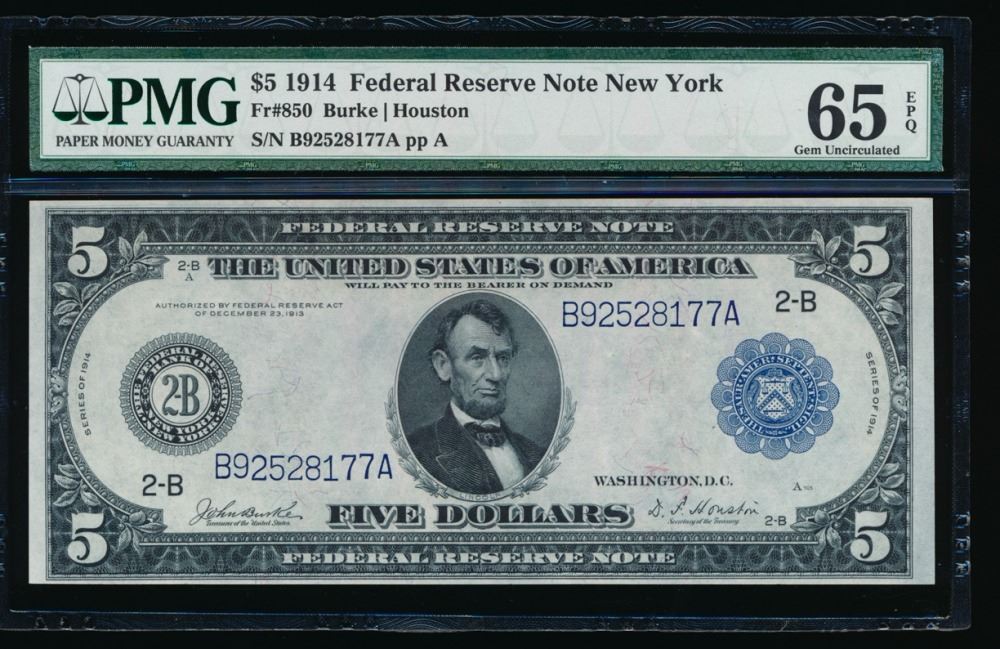 One 1914 $5 New York Federal Reserve Bank Note PMG 65EPQ.