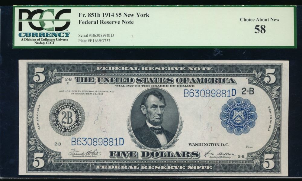 One 1914 $5 New York Federal Reserve Note PCGS 58.