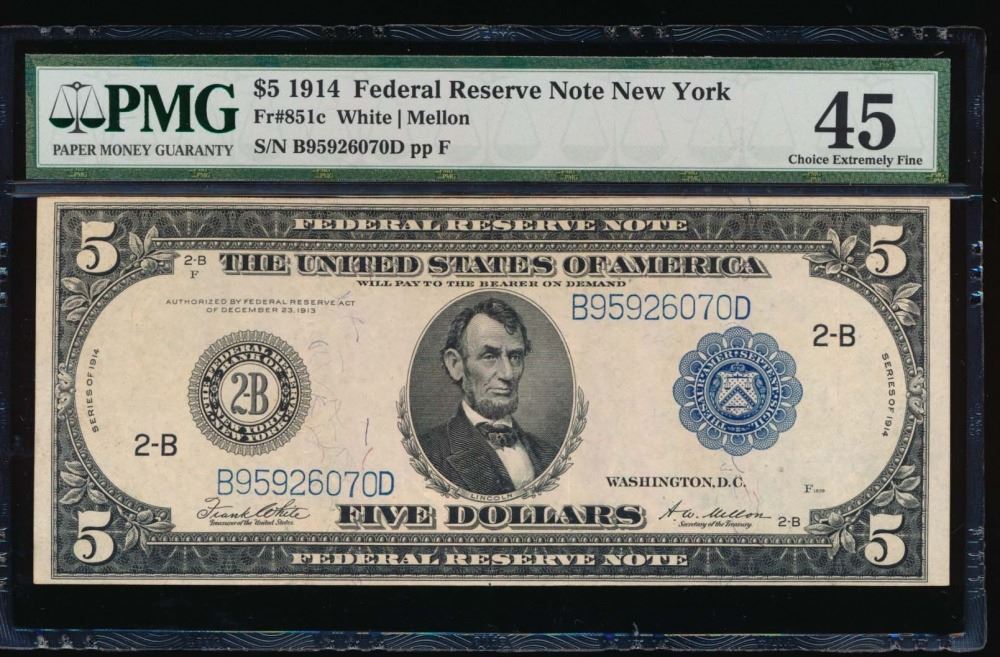 One 1914 $5 New York Federal Reserve Note PMG 45.