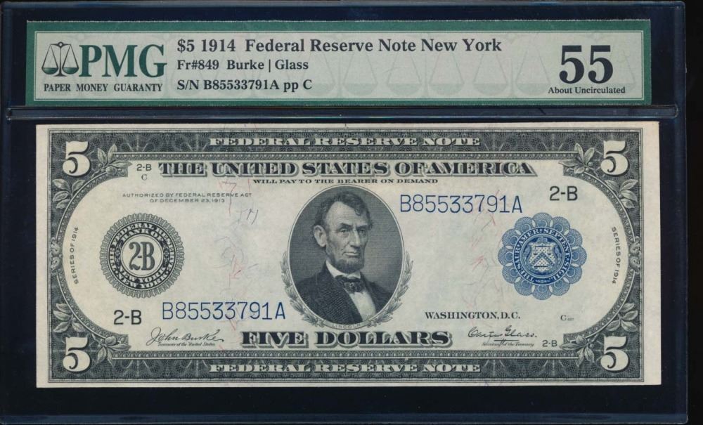 One 1914 $5 New York Federal Reserve Note PMG 55.