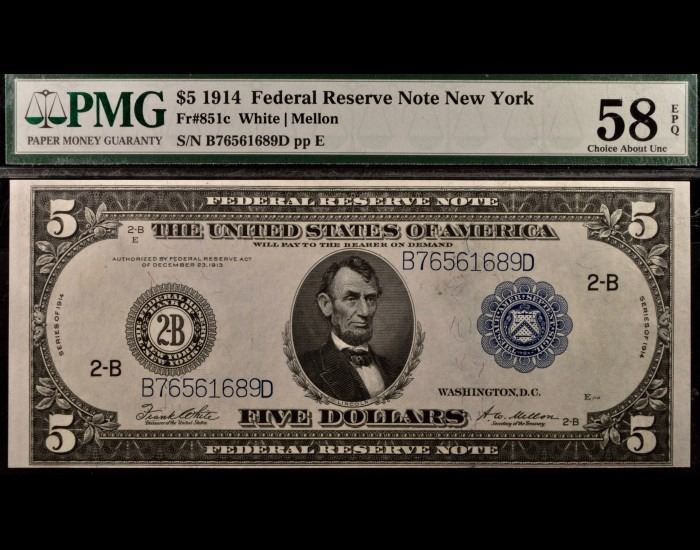 One 1914 $5 New York Federal Reserve Note PMG 58EPQ.