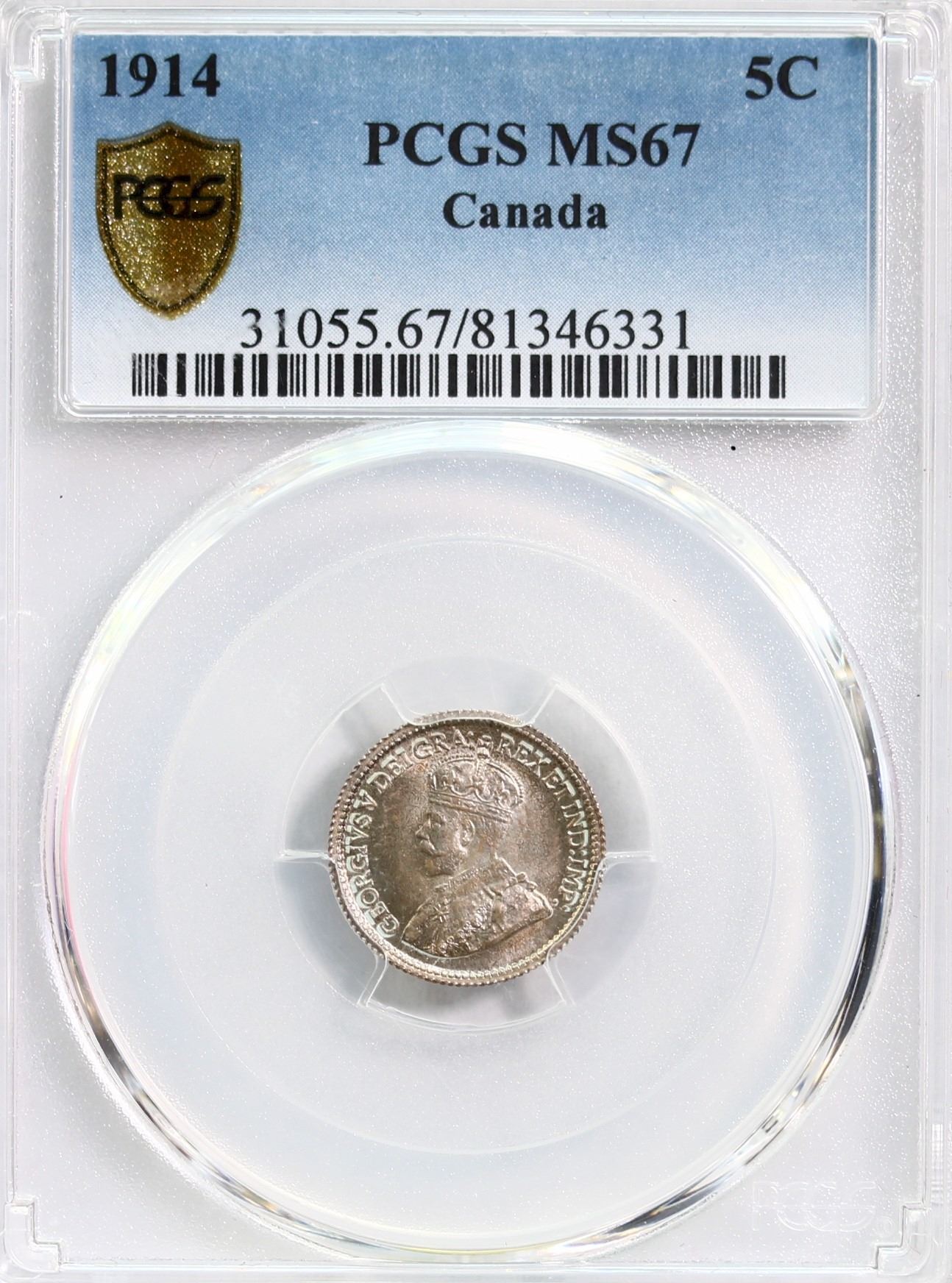 1914 5¢ PCGS Superb Gem Mint State-67. Vivid details with stunning crisp white fields and touch of golden perimeter tones. An elegant example for grade.