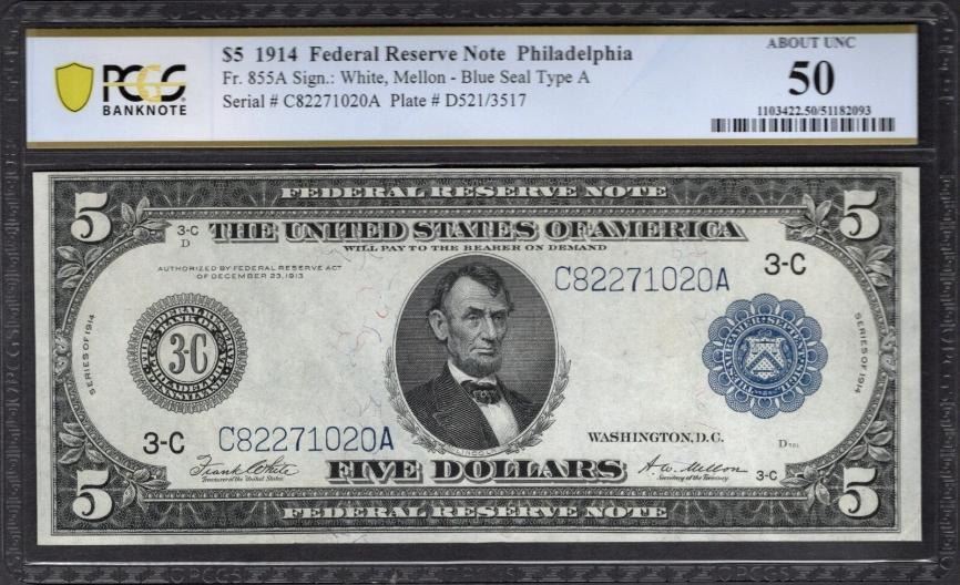 One 1914 $5 Philadelphia FRN PCGS 50.