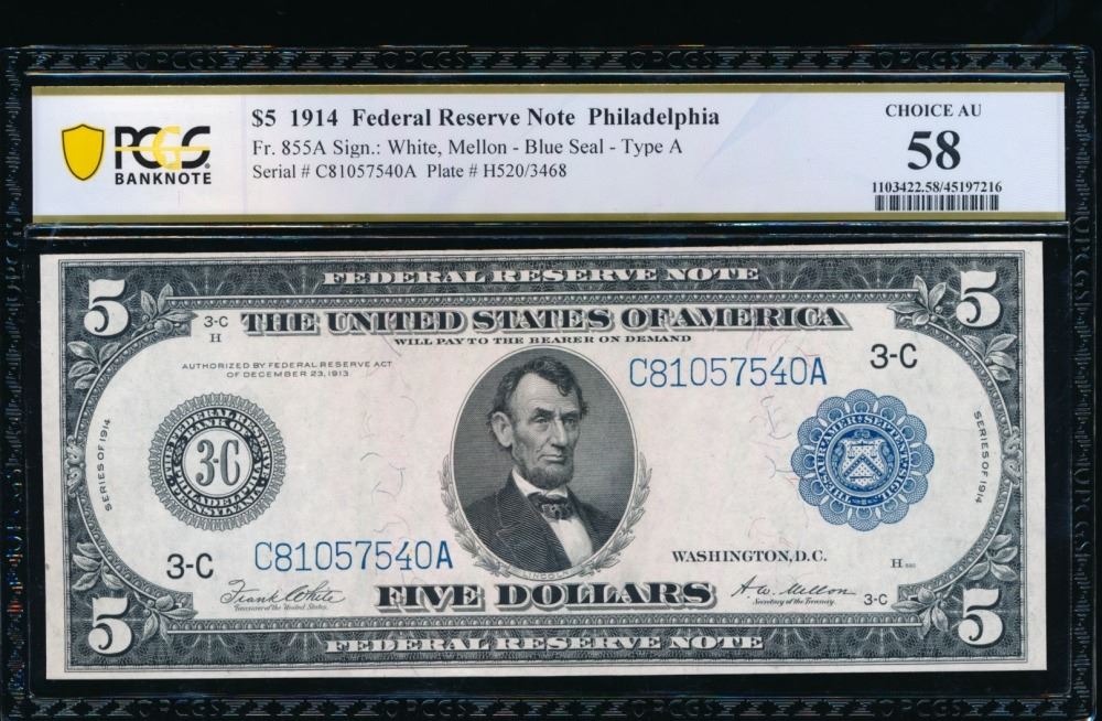 One 1914 $5 Philadelphia FRN PCGS 58.