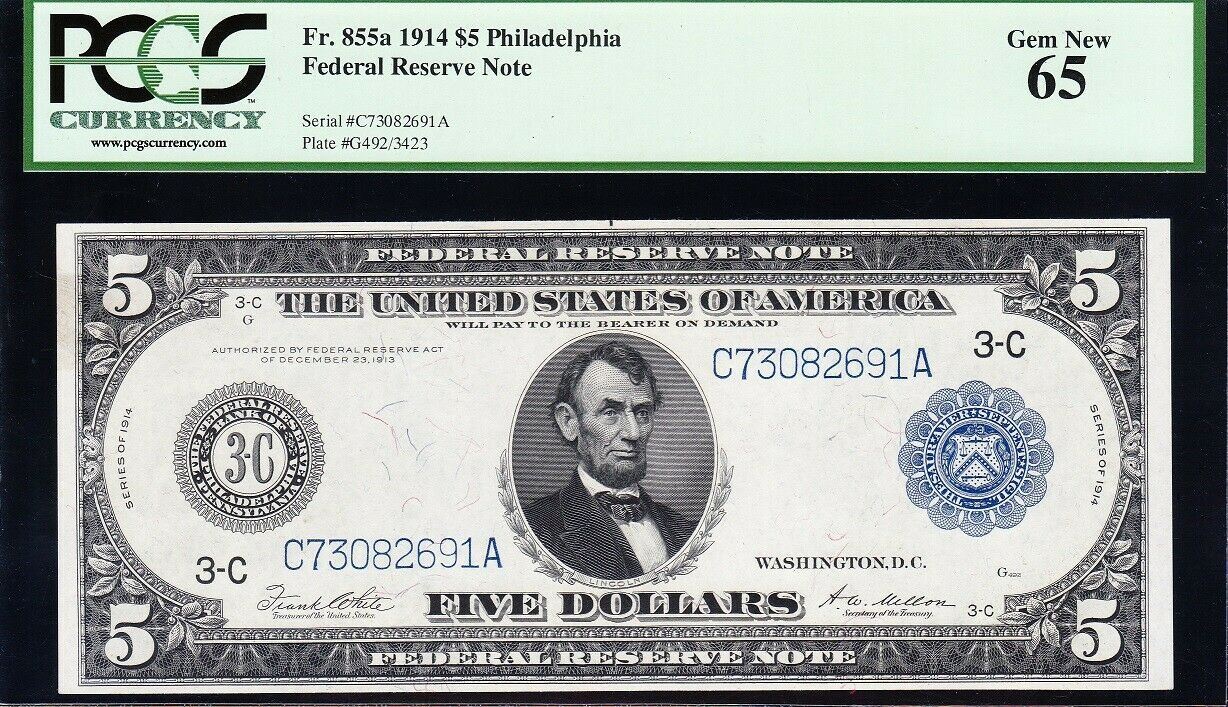 One 1914 $5 Philadelphia FRN PCGS 65.