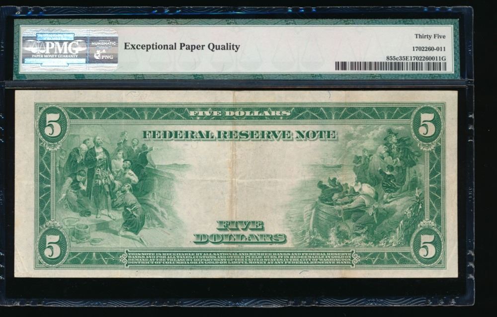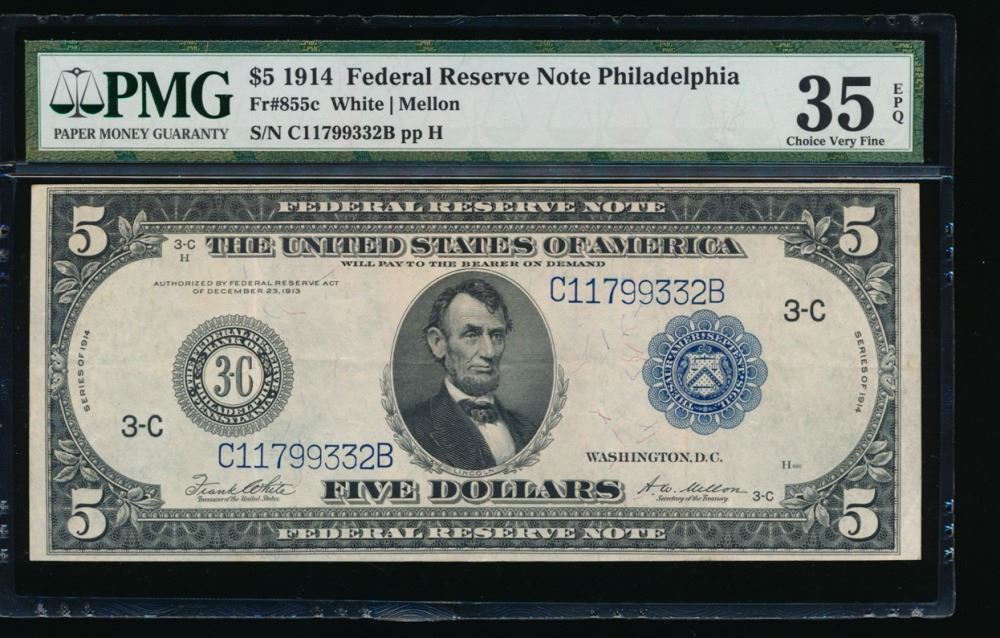 One 1914 $5 Philadelphia Federal Reserve Note PMG 35EPQ.
