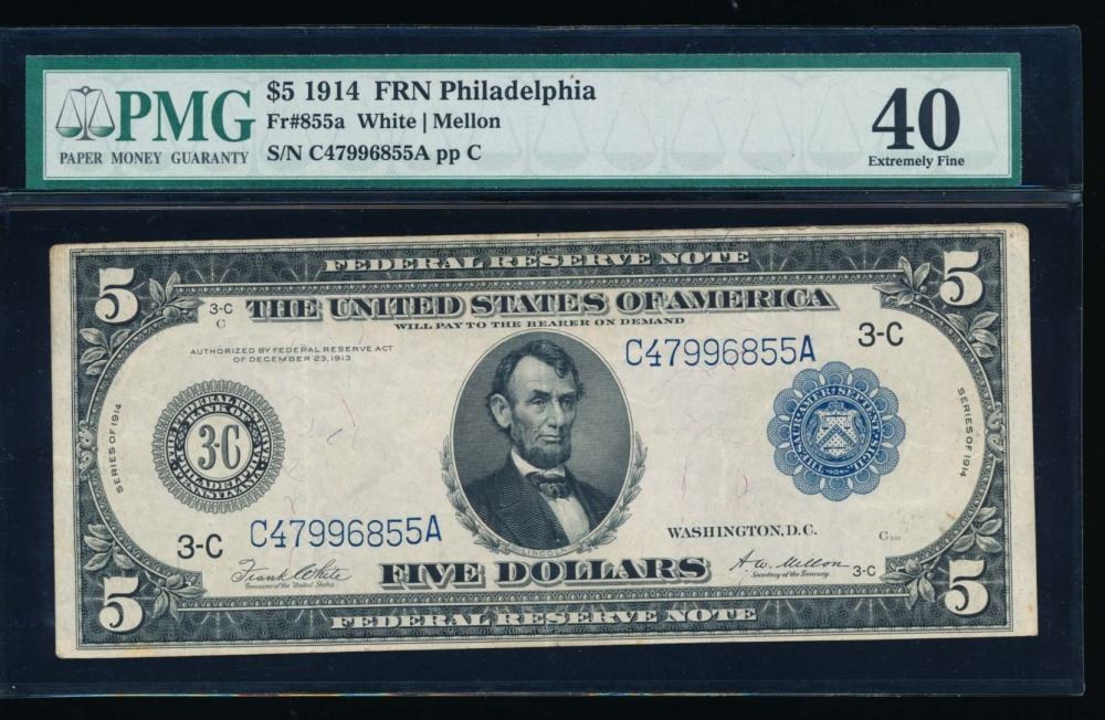 One 1914 $5 Philadelphia Federal Reserve Note PMG 40.