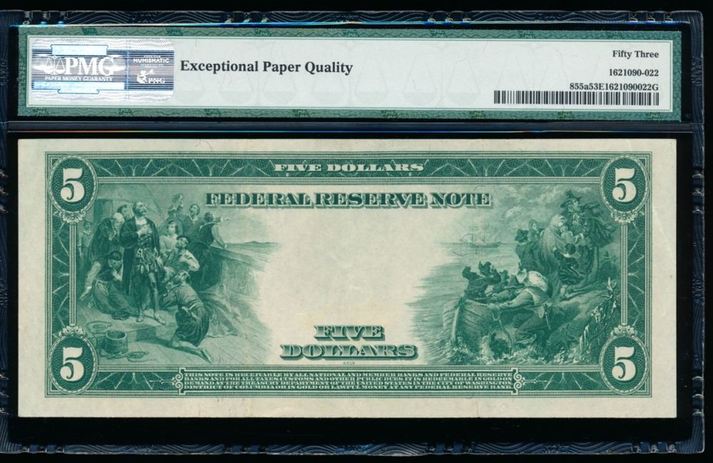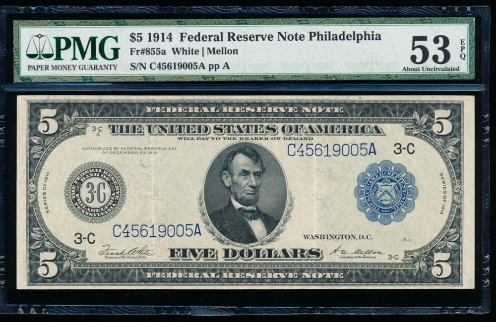 One 1914 $5 Philadelphia Federal Reserve Note PMG 53EPQ.