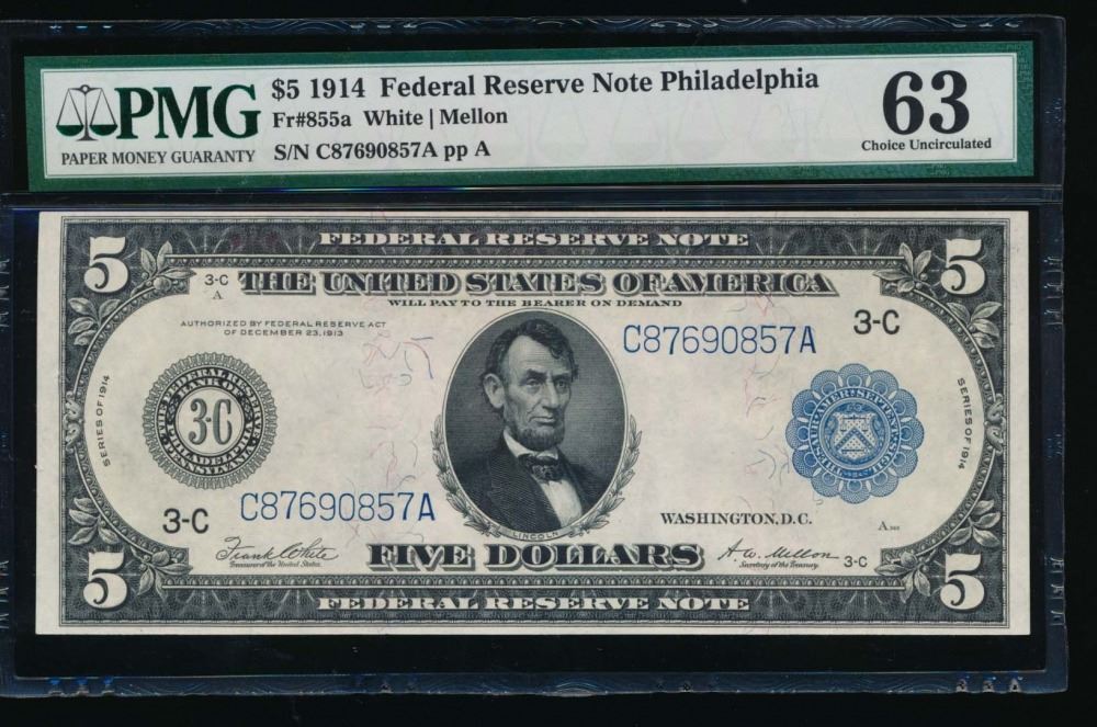 One 1914 $5 Philadelphia Federal Reserve Note PMG 63.