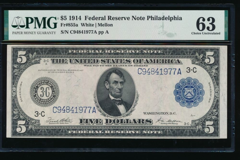 One 1914 $5 Philadelphia Federal Reserve Note PMG 63.