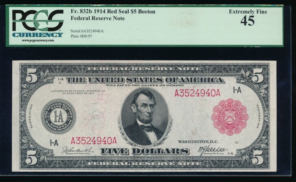 One 1914 $5 Red Seal Boston FRN PCGS 45.