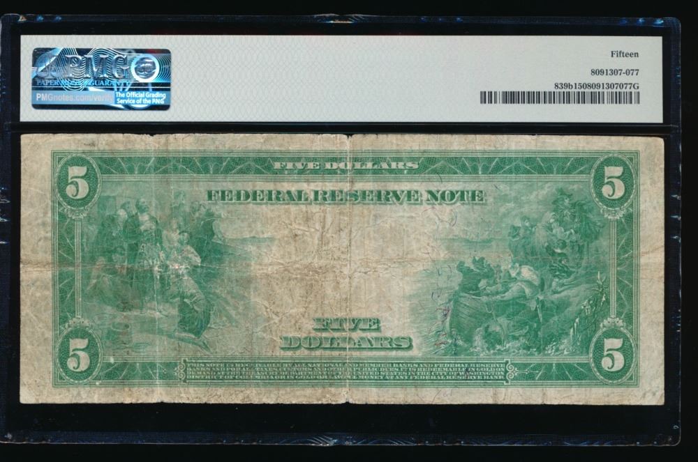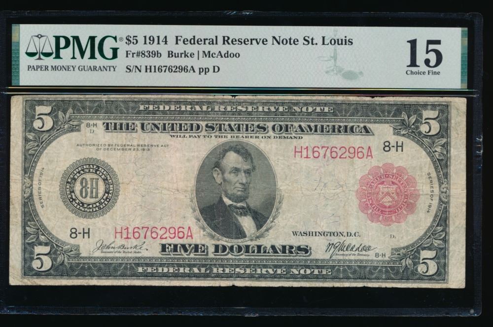 One 1914 $5 Red Seal St Louis FRN PMG 15.