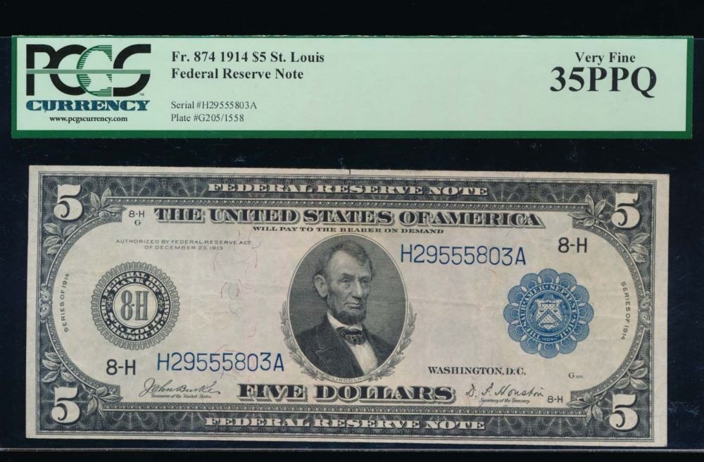 One 1914 $5 St Louis Federal Reserve Note PCGS 35PPQ.