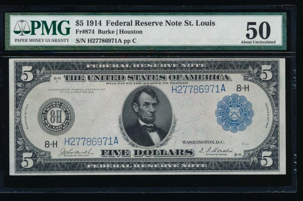 One 1914 $5 St Louis Federal Reserve Note PMG 50.