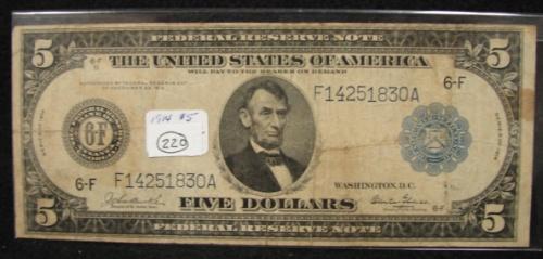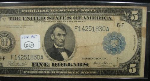 1914 $5 U.S. FEDERAL RESERVE NOTE. VF.
