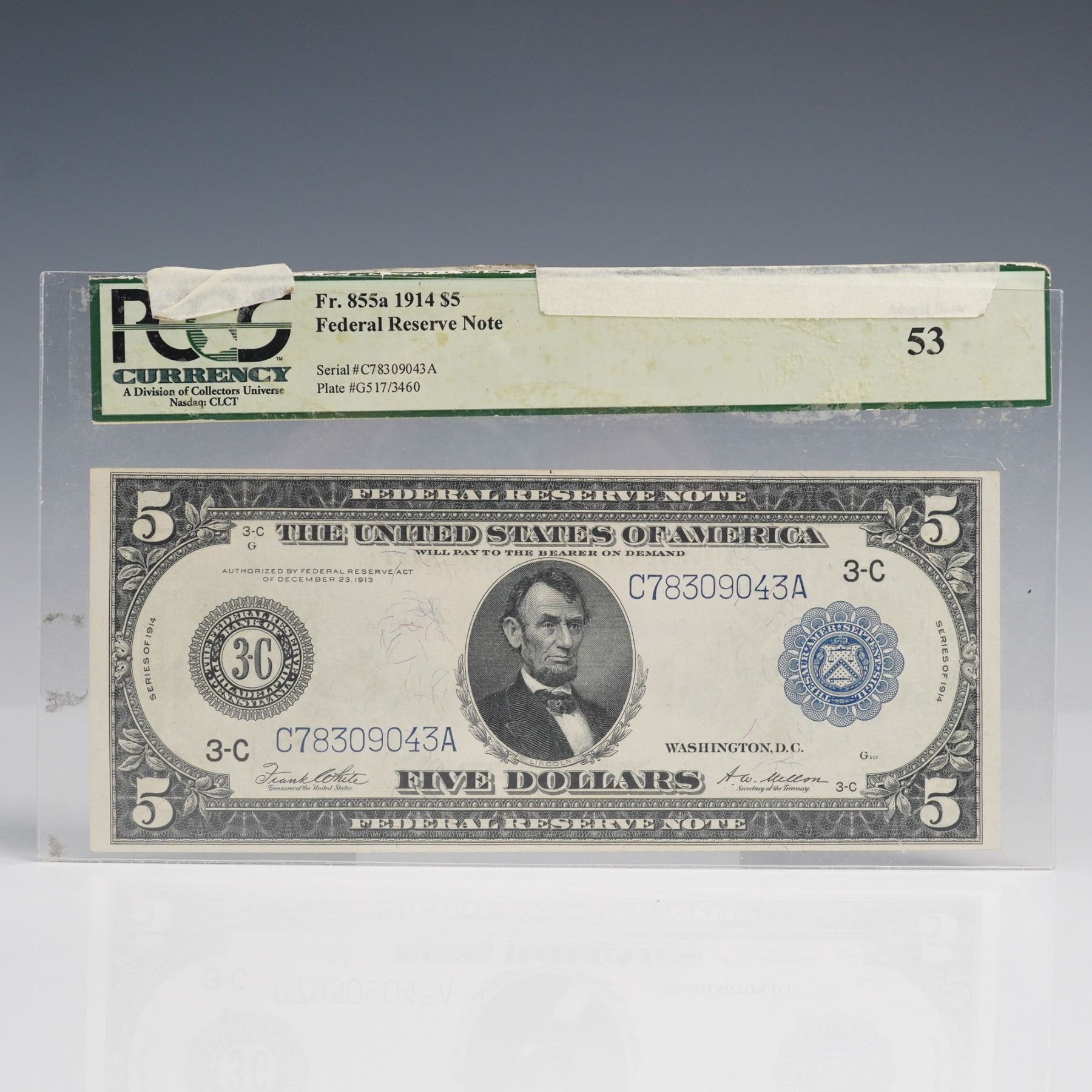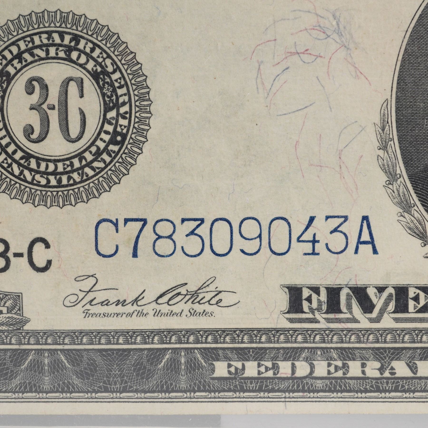 An exceptional 1914 $5 Federal Reserve Note issued by the Federal Reserve Bank of Philadelphia. The obverse showcases an intricate engraved portrait of Abraham Lincoln framed by ornate borders and flanked by decorative denomination numerals, while the serial number C78309043A appears twice in vivid blue ink. Below the vignette are the signatures of Frank White, Treasurer of the United States, and Assistant Secretary of the Treasury John Burke. The reverse is a dramatic tableau engraved in green, depicting two historic vignettes; Columbus Landing in the New World and The Pilgrims; symbolizing the origins of American settlement. Executed in exquisite detail.