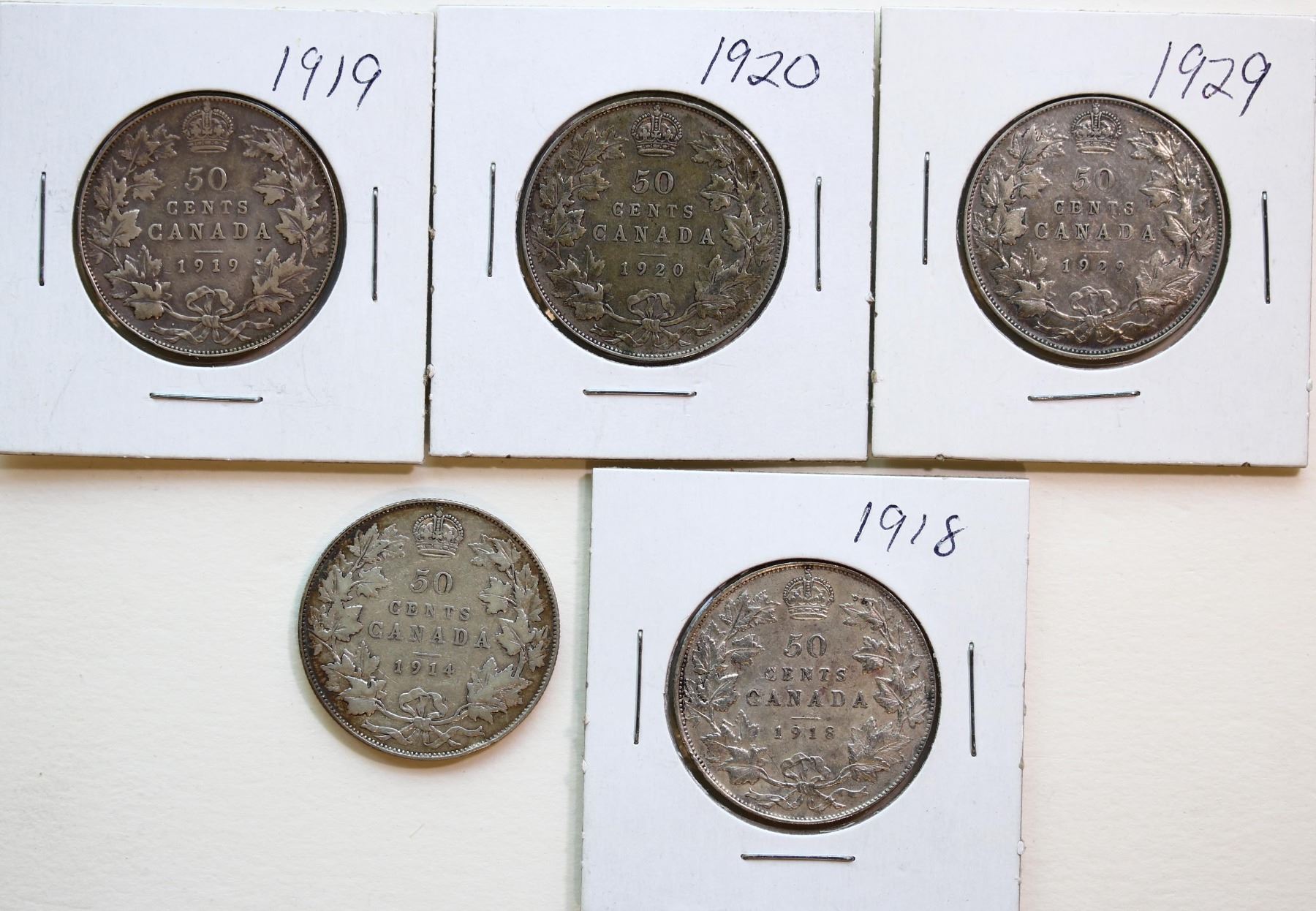 1914 50¢, 1918, 1919, 1920, 1929, Lot of 5 coins Fine or better.