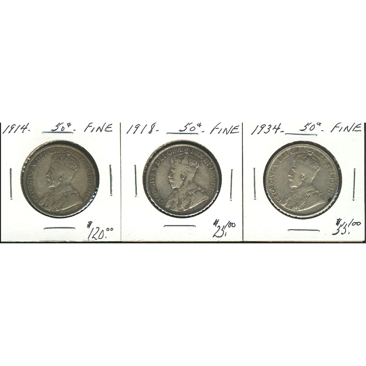 1914 50¢, 1918 & 1934. Lot of 3 coins all Fine. (PBA).