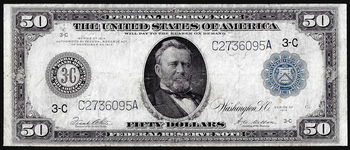 One 1914 $50 Federal Reserve Bank Note Philadelphia.