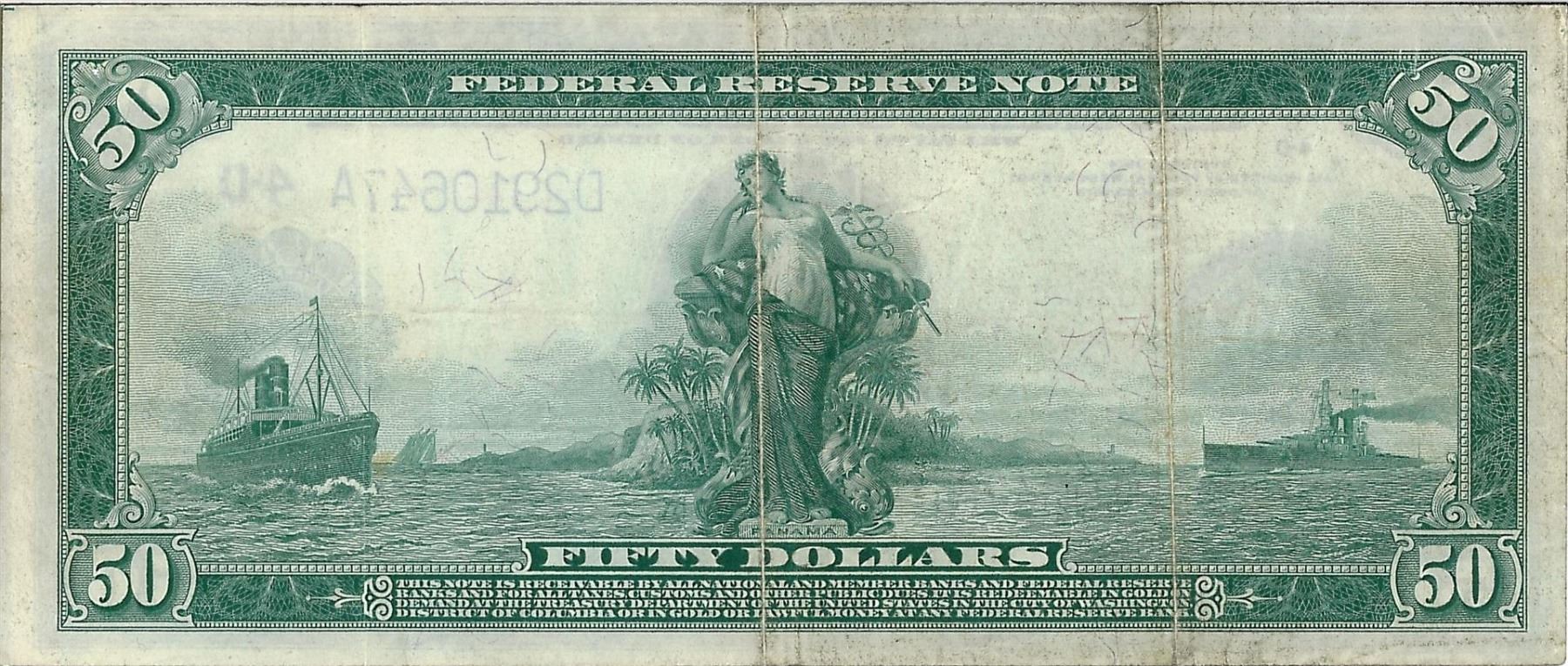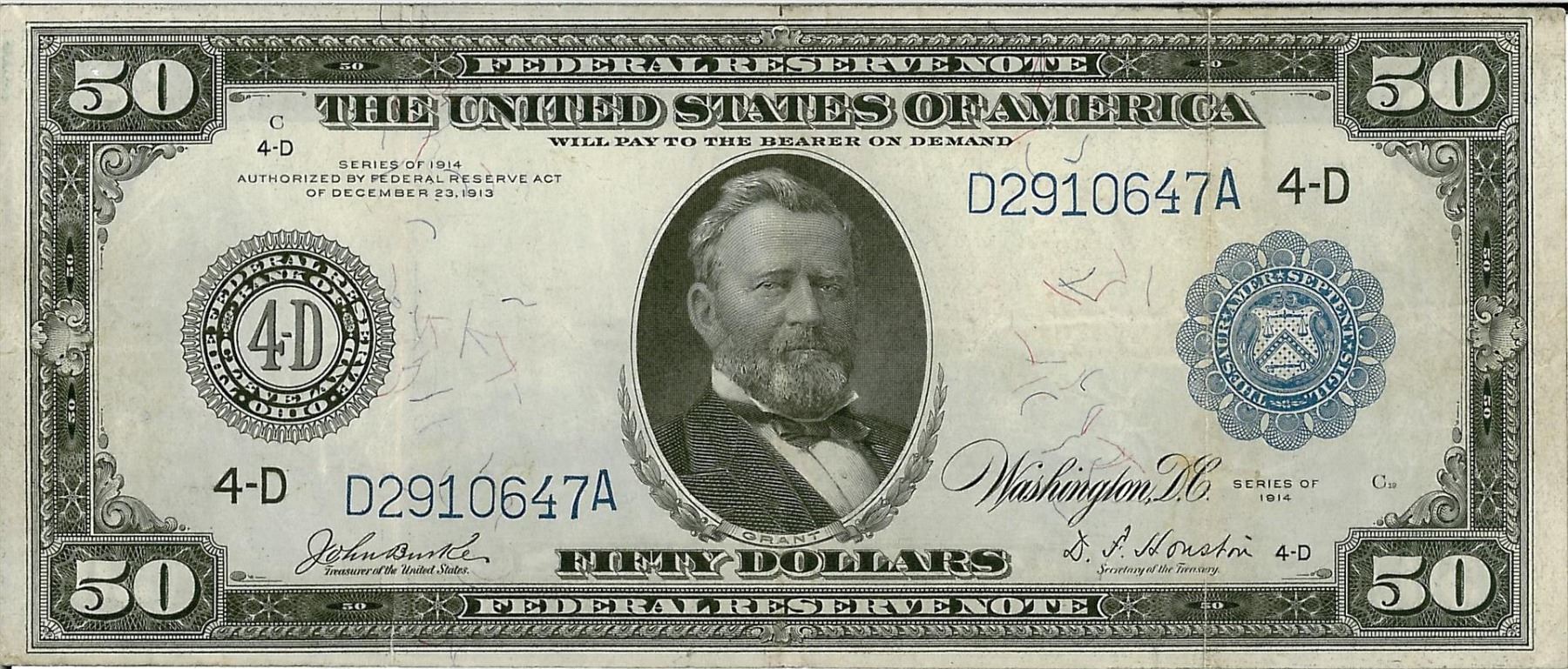 One 1914 $50 Federal Reserve Bank Note. The serial number is 2910647.