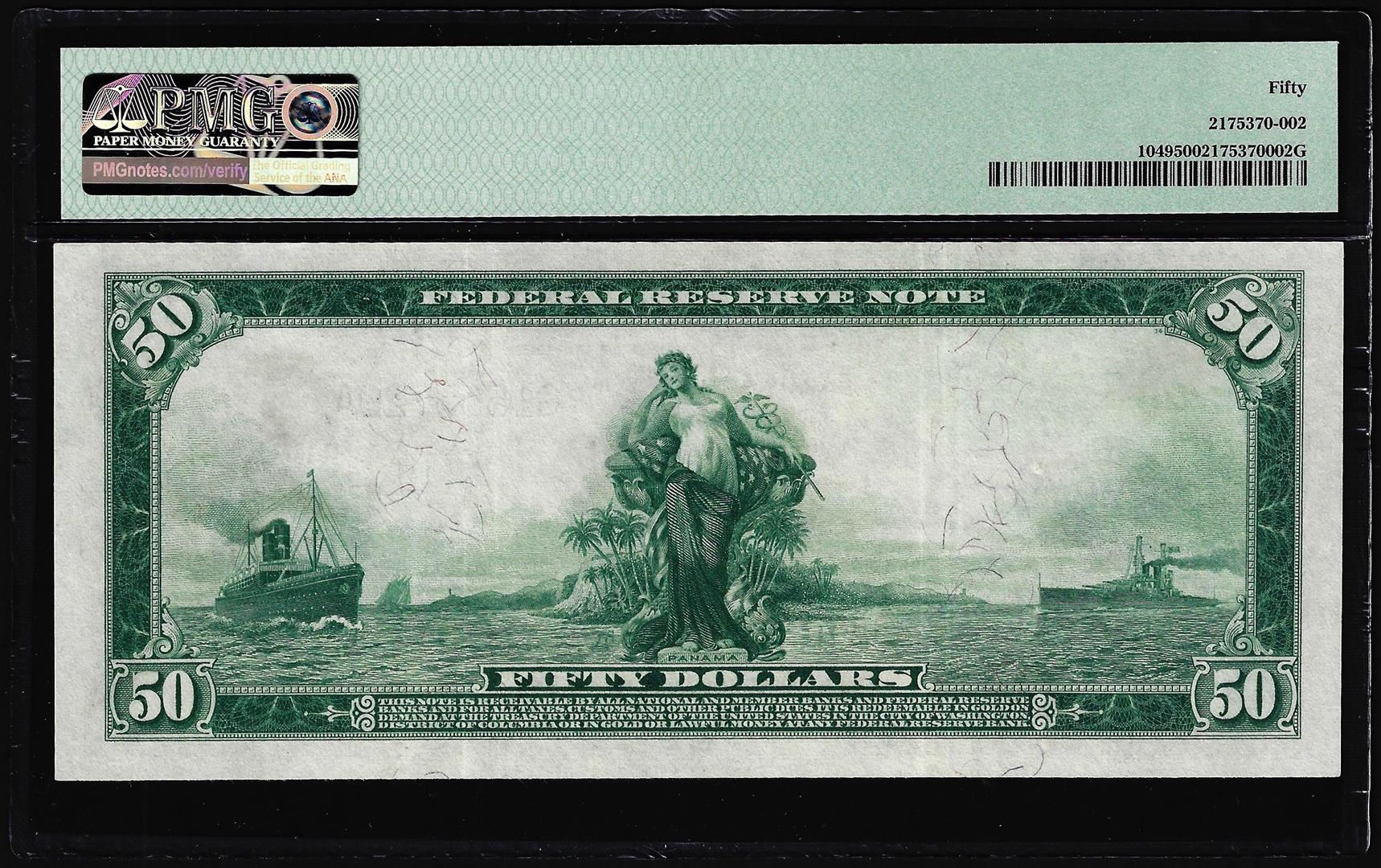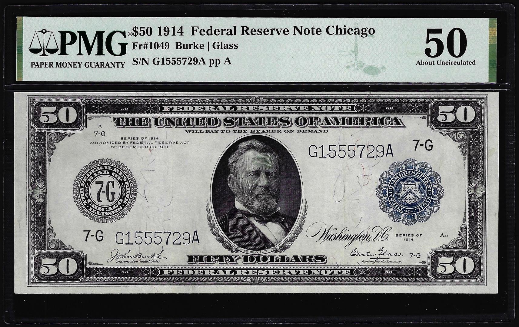 One 1914 $50 Federal Reserve Note Chicago Fr.1049 PMG About Uncirculated 50. PMG Certified.