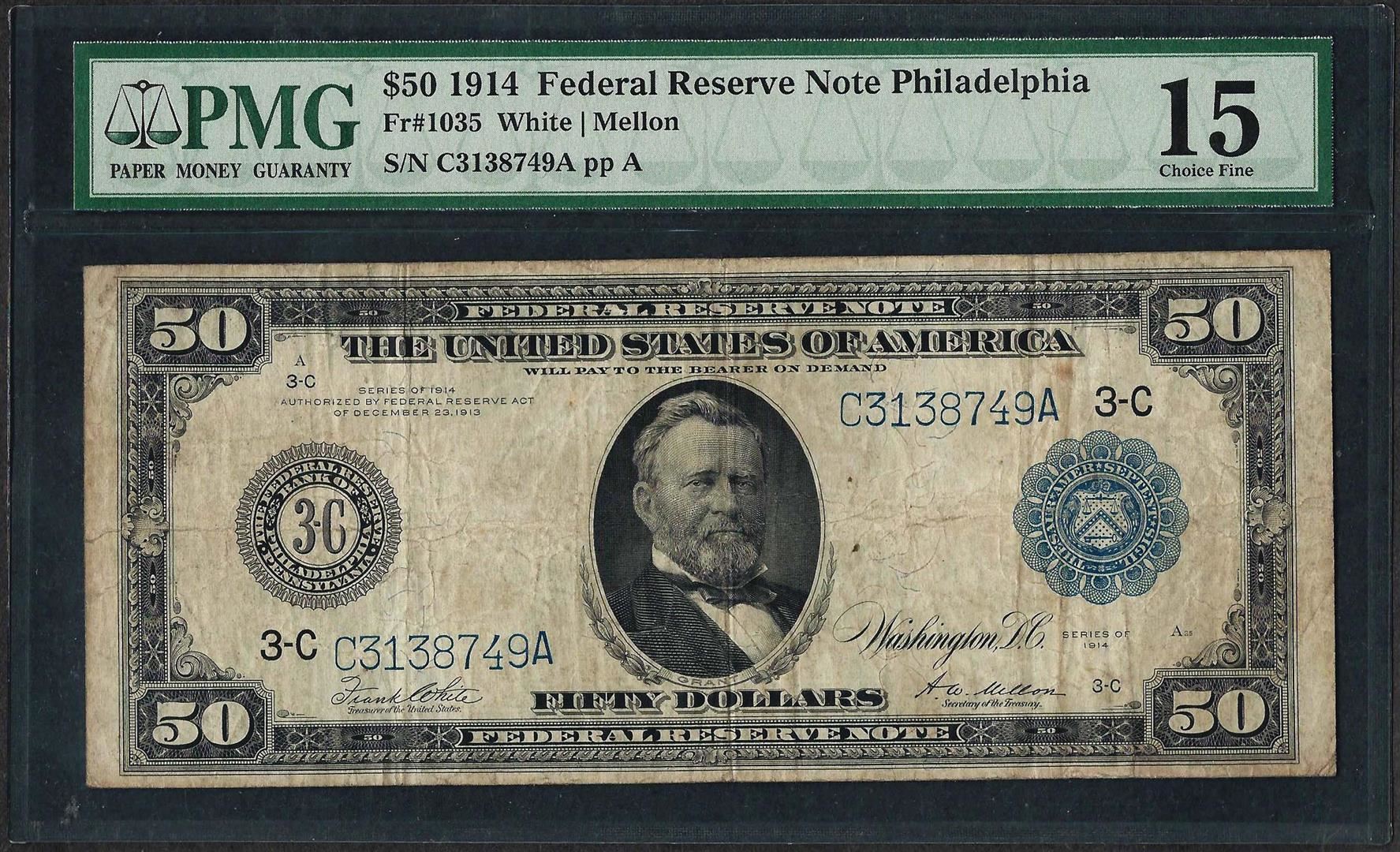One 1914 $50 Federal Reserve Note Philadelphia Fr.1035 PMG Choice Fine 15. PMG Certified.