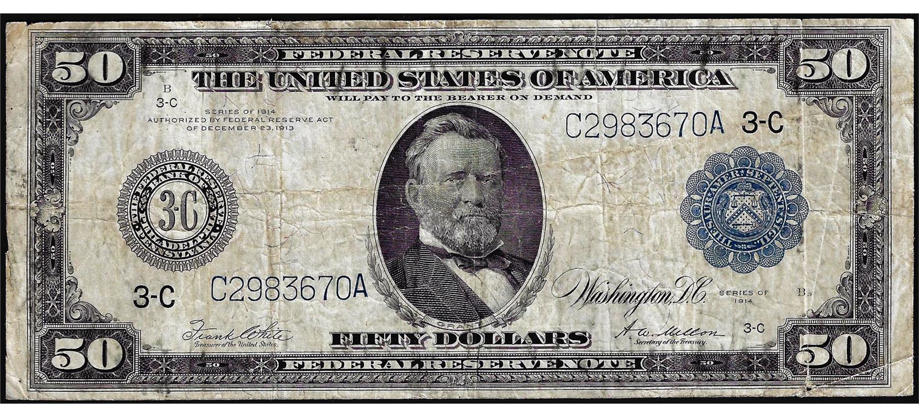 One 1914 $50 Federal Reserve Note Philadelphia.