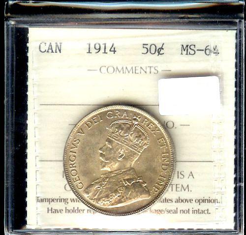 1914 50¢ ICCS MS64 PQ Brilliant with light golden tone. This is an excessively rare and second best date of the George V series after the 1921 Fifty cents. If you are looking for a good investment or a very rare coin, you should seriously consider th