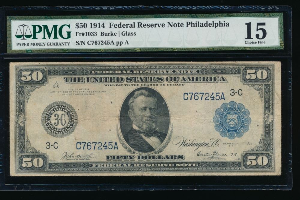One 1914 $50 Philadelphia Federal Reserve Note PMG 15.