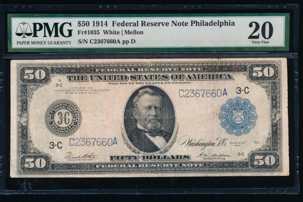 One 1914 $50 Philadelphia Federal Reserve Note PMG 20.