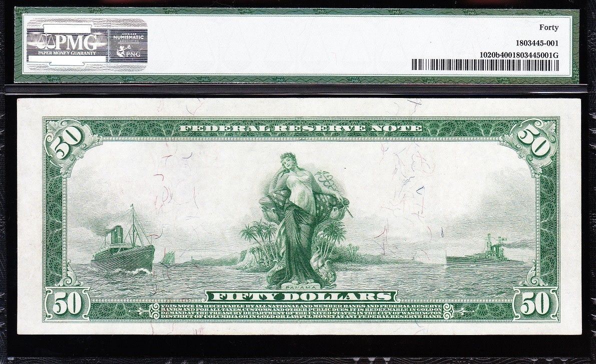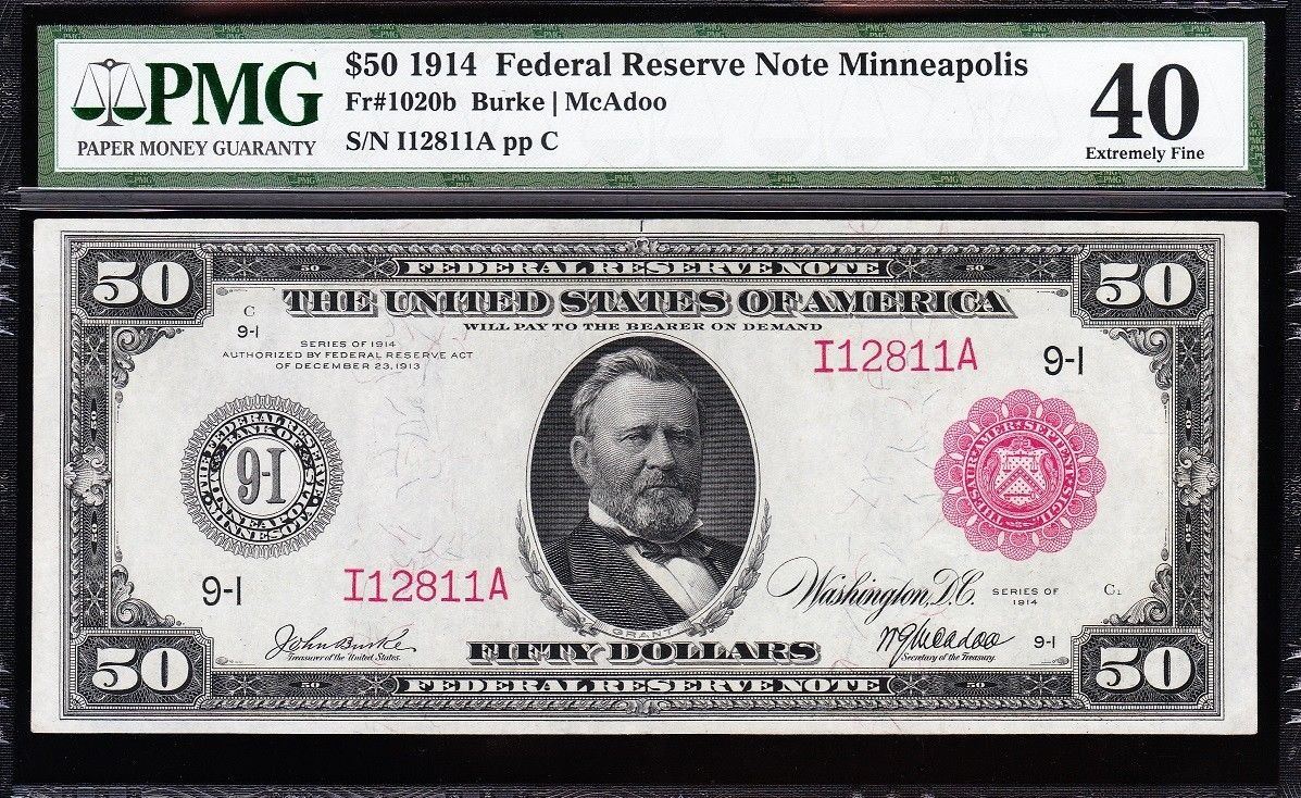 One 1914 $50 Red Seal Minneapolis Federal Reserve Note PMG 40.