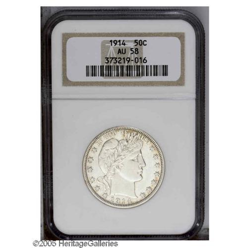 <B>1914<50C> AU58 NGC.</B></I> Light rub is seen across Liberty's face on this example that has mint state luster with small flecks of brown on the reverse.