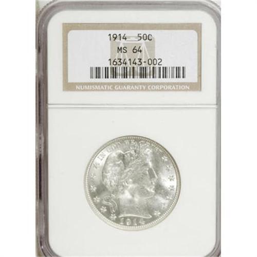 <B>1914 50C MS64 NGC.</B></I> The low mintage of 124,300 coins has made this a popular coin on the want lists of many a collector. Fortunately, Mint State pieces are available for a price. This piece boasts abundant cartwheel luster over the silver-white surfaces. The strike is excellent, but a few ticks and abrasions keep this attractive coin out of the Gem level. Census: 36 in 64, 8 finer (1/08).<BR><I>From The Southwest Collection.</B></I><BR><BR><B>Coin Engraver:</B> Charles E. Barber<BR><BR><b>Shipping:</b> Coins & Currency (<a target="_blank" href="http://www.heritageauctions.com/common/shipping.php">view shipping information</a>)