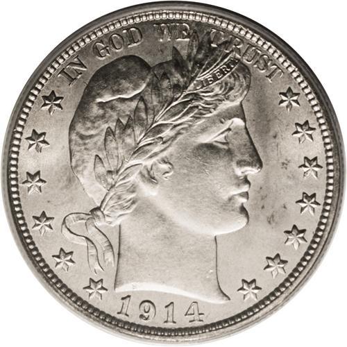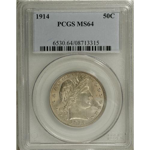 <B>1914 50C MS64 PCGS.</B></I> Softly lustrous with light, even gray-gold patina over the surfaces. A few light abrasions, including one on the chin, bar the way to a higher grade. By 1914, the Barber design had worn out its welcome, though regulations caused the Mint to continue the design until Weinman's design appeared in 1916. Population: 41 in 64, 8 finer (12/06).<BR><BR><b>Shipping:</b> Coin/Currency (<a target="_blank" href="http://www.heritageauctions.com/common/shipping.php">view shipping information</a>)