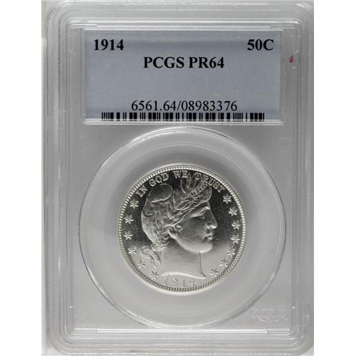 <B>1914<50C> PR64 PCGS.</B></I> Crisply struck with essentially brilliant surfaces that reveal very mild cloudiness on the upper left portion of the reverse. The devices are nicely frosted, allowing mild cameo contrast on each side. Wispy slide marks on Liberty's face and neck prevent a higher grade.