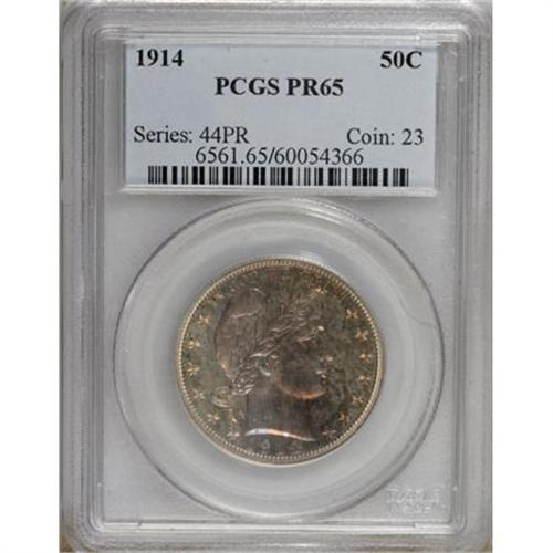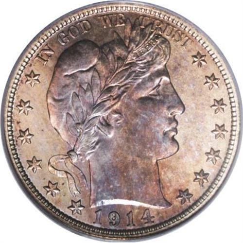 <B>1914 50C PR65 PCGS.</B></I> All of the design elements are sharply struck. The fields are highly reflective beneath layers of milky patina. The obverse shows a combination of lilac, amber, and pale green coloration, while the reverse displays tan and sea-green toning. Hairlines and contact marks are nonexistent. Population: 23 in 65, 25 finer (6/07). <BR><BR><b>Shipping:</b> Coins & Currency (<a target="_blank" href="http://www.heritageauctions.com/common/shipping.php">view shipping information</a>)