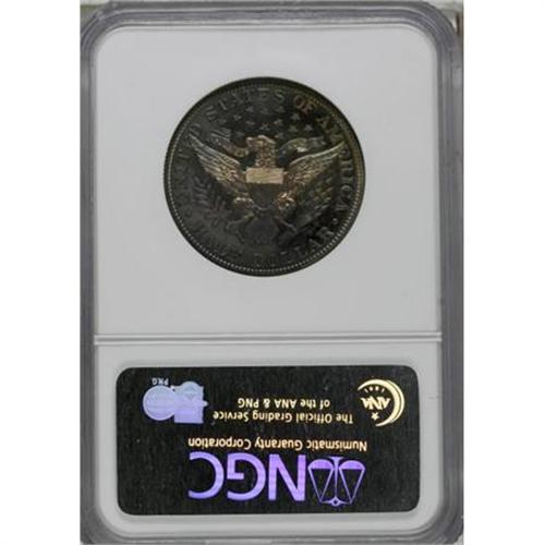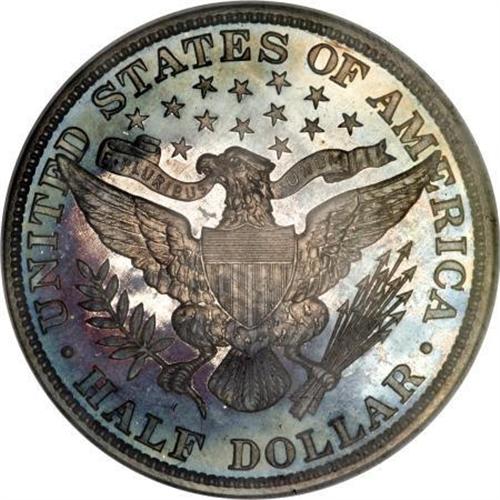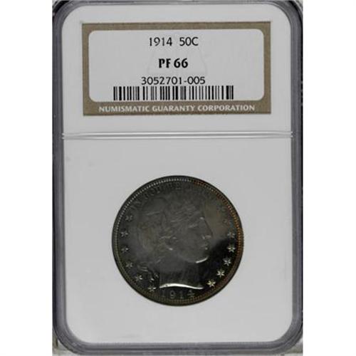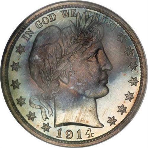 <B>1914 50C PR66 NGC.</B></I> The top half of the obverse is a luminous cloud of dove gray and lilac, while the lower half is a more electric sunset of gold and ruby. The reverse displays a similar blend of colors and both sides are well-preserved, highly reflective, and well struck. A 1914 Proof quarter that is offered in this auction is nearly a partner to this piece.<BR><BR><B>Coin Engraver:</B> Charles E. Barber<BR><BR><b>Shipping:</b> Coins & Currency (<a target="_blank" href="http://www.heritageauctions.com/common/shipping.php">view shipping information</a>)