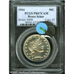 <B>1914 50C PR67 Cameo PCGS.</B></I> The 1914 boasts the lowest mintage of all Barber Half Dollar proofs, with just 380 pieces struck, and is generally only found with very limited or no contrast. This sterling representative has an unusual degree of field to motif contrast, with fields that offer glassy brilliance and show illimitable depth of mirrored reflectivity. Whispers of faint champagne patina visit localized areas of each side, as do hints of speckled milky color. The surfaces are immaculately well preserved, showing no mentionable contact marks or spotting, and exhibit razor-sharp design elements. The rarity of this issue is conveyed by the PCGS population report below. Population: 1 in 67, 0 finer (1/05).<BR><I>From the Bruce Scher #1 All-Time PCGS Registry Set.</B></I> Lot:4130