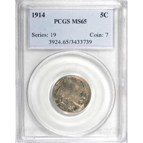 <B>1914 5C MS65 PCGS.</B></I> PCGS Population (281/138). NGC Census: (167/54). Mintage: 20,665,738. Numismedia Wsl. Price for NGC/PCGS coin in MS65: $350. (#3924)<BR><BR><B>Coin Engraver:</B> James E. Fraser<BR><BR><b>Shipping:</b> Coins & Currency (<a target="_blank" href="http://www.heritageauctions.com/common/shipping.php">view shipping information</a>)