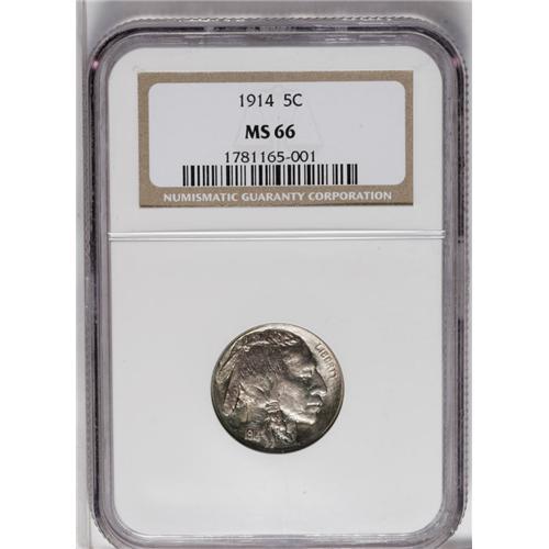 <B>1914<5C> MS66 NGC.</B></I> This delightful Premium Gem is well struck, with delectable purplish-gold surfaces on each side. Not rare, but seldom seen finer: NGC and PCGS combined have certified only 23 pieces finer (8/06).