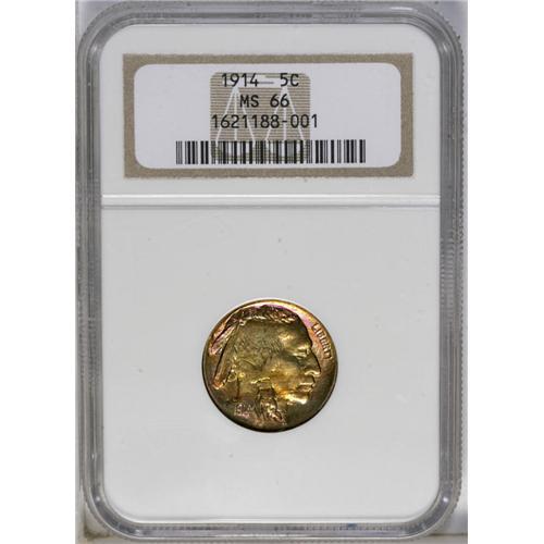 <B>1914<5C> MS66 NGC.</B></I> This elusive second-year Gem features peripheral magenta toning around a mustard-yellow center. Well struck and lustrous with only a few marks that keep this coin from an even higher grade.