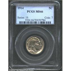 1914 5C MS66 PCGS. A razor-sharp Gem that has shimmering luster across the greenish-gold and lavender tinged surfaces. Magnificently preserved, and a finer specimen could hardly be imagined.From the BTB Collection of Buffalo Nickels. Important notice: We expect to be auctioning lots at the rate of 200-250 per hour. Sometimes eBay Premier live bid software cannot keep up with that pace, so we strongly recommend that you place a realistic proxy bid now as insurance to avoid disappointment. Also please note that all Heritage/CAA lots purchased through eBay Premier carry a 20% Buyer's Premium. Please make sure you read the Terms and Conditions.
