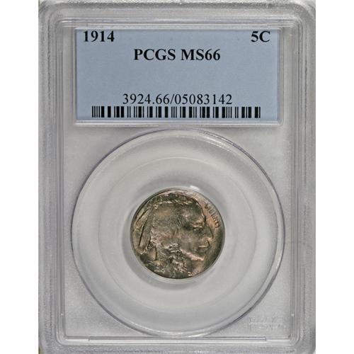 <B>1914 5C MS66 PCGS.</B></I> Rose-red and olive-gray patina enriches this shimmering and unabraded Premium Gem. Well struck save for the tail and the tops of LIBERTY. Boldly clashed beneath the largest feather and beneath the UNI in UNITED.<BR><BR><b>Shipping:</b> Coin/Currency (<a target="_blank" href="http://www.heritageauctions.com/common/shipping.php">view shipping information</a>)