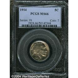 <B>1914<5C> MS66 PCGS.</B></I> This well struck Buffalo nickel displays an attractive blend of pale blue, rose, and gold color over lustrous surfaces. A small, inconspicuous mark in the Indian's hair does not detract in the least from the strong eye appeal of this lovely preserved specimen. <BR><BR><B>Important notice:</B> Heritage usually auctions material at the rate of 200-250 lots per hour. On some occasions eBay Live bid software or the Internet may not be able to keep up with the pace of the auction. We recommend placing a realistic absentee bid now as insurance to avoid disappointment. Occasionally the auctioneer may eliminate or reject an eBay Live bid, and the auctioneer may also reopen a lot after the close of the eBay live bidding (usually because we missed an audience bid), and may reject your bid even if it shows you as the winning bidder. By bidding via eBay Live, you agree that Heritage may award the lot to another bidder at its sole discretion under the circumstances described above or any other reasonable circumstances. Since eBay bids are not shown to us until we open the lot on the floor, we treat those bids just like floor bids. In most cases the floor responds before the eBay bid is presented to us, due to Internet lag time, so for consistency we have made it a policy that floor bids are always considered first over tie eBay live bids. Also please note that all Heritage lots purchased through eBay Live carry a 20% Buyer's Premium. Please make sure you read the Terms and Conditions before you bid.
