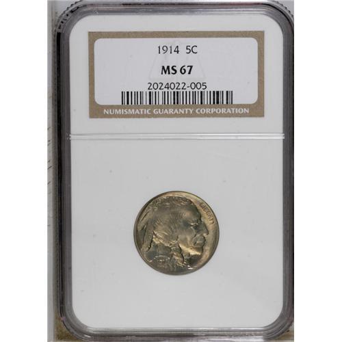 <B>1914 5C MS67 NGC.</B></I> In his most recent book on the Buffalo nickel series <I>(The Complete Guide to Buffalo Nickels)</B></I> David Lange states that the '14-P is "slightly scarce but available in all grades Good through mint state. Choice and gem pieces can be had for a price." That may be true, but Superb examples such as this are very seldom encountered. The surfaces are virtually flawless, and the devices are almost fully struck up in all areas. Exceptional mint luster is seen on both obverse and reverse with an overlay of rich, multicolored patina. A wonderful early type piece or the ultimate representative of this early issue. Population: 7 in 67, 0 finer (10/04).<BR><BR><b>Shipping:</b> Coin/Currency (<a target="_blank" href="http://www.heritageauctions.com/common/shipping.php">view shipping information</a>)