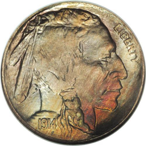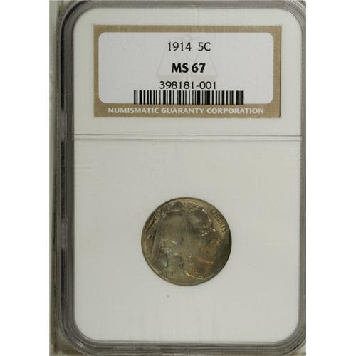 <B>1914 5C MS67 NGC.</B></I> Pale gold and turquoise-blue is the rule on this shining Superb Gem, but a crescent of deep ruby-orange at the lower right obverse adds fire to the surfaces. Solidly struck with strong luster and immense eye appeal. This piece is tied for the finest certified by either NGC or PCGS (12/06).<BR><BR><b>Shipping:</b> Coin/Currency (<a target="_blank" href="http://www.heritageauctions.com/common/shipping.php">view shipping information</a>)