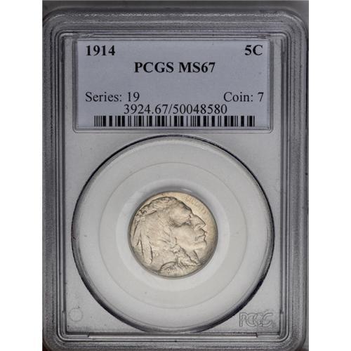 <B>1914<5C> MS67 PCGS.</B></I> In his book on the Buffalo nickel series, <I>The Complete Guide to Buffalo Nickels,</B></I> David Lange states that the '14-P is "slightly scarce but available in all grades G through Mint State. Choice and gem pieces can be had for a price." That may be true, but Superb examples such as this are very seldom encountered. The surfaces are virtually flawless, and the devices are almost fully struck up in all areas. Exceptional mint luster is seen on both obverse and reverse with an overlay of light golden-rose patina. A wonderful early type piece and the ultimate representative of this early issue. Population: 15 in 67, 0 finer (4/06).