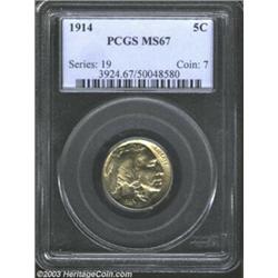 <TR><TD width="100%"><TABLE cellSpacing=1 cellPadding=3 width="100%" border=0><TBODY><TR><TD width="100%" bgColor=#79735c><FONT face=arial color=#ffffff size=3><B>Description</B> </FONT></TD></TR><TR><TD width="100%" bgColor=#ffffff><FONT face=arial size=2><B>1914 5C MS67 PCGS.</B></I> In his most recent book on the Buffalo nickel series <I>(The Complete Guide to Buffalo Nickels)</B></I> David Lange states that the '14-P is "slightly scarce but available in all grades G through mint state. Choice and gem pieces can be had for a price." That may be true, but Superb examples such as this are very seldom encountered. The surfaces are virtually flawless, and the devices are almost fully struck up in all areas. Exceptional mint luster is seen on both obverse and reverse with an overlay of light golden-rose patina. A wonderful early type piece or the ultimate representative of this early issue. Population: 10 in 67, 0 finer (4/03). </FONT></TD></TR></TBODY></TABLE></TD></TR></TBODY></TABLE><BR><A name=PricesRealized></A><TABLE cellSpacing=0 cellPadding=0 width="100%" bgColor=#000000 border=0><TBODY><TR><TD width="100%"><TABLE cellSpacing=1 cellPadding=3 width="100%" border=0><TBODY><TR><TD width="100%" bgColor=#79735c><A name=PR><FONT face=arial color=#ffffff size=3><B>Previous Prices from Heritage Auctions</B> </FONT></A></TD></TR><TR><TD bgColor=#f6f6ed><TABLE cellSpacing=0 cellPadding=0 width="100%" border=1><TBODY><TR><TD align=middle width="33%"><B>Date</B></TD><TD align=middle width="33%"><B>Service</B></TD><TD align=middle width="33%"><B>Price</B></TD></TR><TR bgColor=whitesmoke><TD width="33%"><B>02/03/1993</B></TD><TD width="33%">PCGS</TD><TD width="33%">$2,750.00</TD></TR><TR bgColor=whitesmoke><TD width="33%"><B>09/10/1993</B></TD><TD width="33%">NGC</TD><TD width="33%">$1,925.00</TD></TR></TBODY></TABLE></TD></TR><TR><TD bgColor=#ffffff><FONT face=arial size=1 ?>PLEASE NOTE: All prices realized reflect the final hammer price PLUS the buyer's premium in auctions that charge a buyer's premium. Each item has a notation at the top of the listing indicating whether that lot included a buyer's premium. Example: A item that sells with a final hammer price of $100 and a 20% buyer's premium will display with a price realized of $120. All information listed is intended to be as accurate as possible, but errors are possible. Please use this guide carefully and inform us of any inaccuracies. </FONT></TD></TR></TBODY></TABLE></TD></TR></TBODY></TABLE><BR><TABLE cellSpacing=0 cellPadding=0 width="100%" bgColor=#000000 border=0><TBODY><TR><TD width="100%"><TABLE cellSpacing=1 cellPadding=3 width="100%" border=0><TBODY><TR><TD width="100%" bgColor=#79735c colSpan=6><FONT face=arial color=#ffffff size=3><B>Price Guide*</B> </FONT></TD></TR><TR bgColor=#f6f6ed><TD align=middle><B>Grade</B> </TD><TD align=middle><B>Coin World<BR>(Trends)</B> </TD><TD align=middle><B>Numismedia<BR>Retail</B> </TD><TD align=middle><B>Numismedia<BR>Wholesale</B> </TD><TD align=middle><B>Coin<BR>Universe</B> </TD><TD align=middle><B>Heritage<BR>Value Index</B> </TD></TR><TR bgColor=#ffffff><TD align=middle>66</TD><TD align=right>$1,000.00</TD><TD align=right>$880.00</TD><TD align=right>$680.00</TD><TD align=right>$1,100.00</TD><TD align=right>$848.33</TD></TR><TR style="FONT-WEIGHT: bold" bgColor=#cccfdd><TD align=middle>67</TD><TD align=right>---</TD><TD align=right>---</TD><TD align=right>$5,275.00</TD><TD align=right>$8,750.00</TD><TD align=right>$6,125.00</TD></TR><TR bgColor=#ffffff><TD align=middle>68</TD><TD align=right>---</TD><TD align=right>---</TD><TD align=right>---</TD><TD align=right>---</TD><TD align=right>---</TD></TR><TR bgColor=#ffffff><TD colSpan=6><FONT size=1>*All information listed is intended to be as accurate as possible, but errors are possible. No item may be returned or refused based on this information which is provided as a service to our customers. You should contact each pricing source directly to determine the accuracy of this information. </FONT></TD></TR></TBODY></TABLE></TD></TR></TBODY></TABLE><BR><TABLE cellSpacing=0 cellPadding=0 width="100%" bgColor=#000000 border=0><TBODY><TR><TD width="100%"><TABLE cellSpacing=1 cellPadding=3 width="100%" border=0><TBODY><TR><TD width="100%" bgColor=#79735c><FONT face=arial color=#ffffff size=3><B>Population Guide</B> </FONT></TD></TR><TR bgColor=#ffffff><TD align=middle><!-- Begin Output of Population Grid--><TABLE cellSpacing=0 cellPadding=0 width="100%" border=0><TBODY><TR><TD vAlign=center><TABLE cellSpacing=0 width="100%" border=1 cellsadding="3"><TBODY><TR><TD vAlign=center><TABLE cellSpacing=0 cellPadding=3 width="100%" border=1><TBODY><TR><TD vAlign=center align=middle bgColor=#f0f1e8 colSpan=2 <CENTER><FONT face=Arial size=2><B>PCGS Pop </B></FONT><CENTER></CENTER></TD><TD vAlign=center align=middle bgColor=#f0f1e8 colSpan=2><CENTER><FONT face=Arial size=2><B>NGC Pop</B></CENTER></FONT></TD></TR><TR><TD vAlign=center><FONT face=Arial size=2>(67)</FONT> </TD><TD vAlign=center align=right><FONT face=Arial size=2>10</FONT> </TD><TD vAlign=center><FONT face=Arial size=2>(67)</FONT> </TD><TD vAlign=center align=right><FONT face=Arial size=2>6</FONT> </TD></TR><TR><TD vAlign=center><FONT face=Arial size=2>(>67)</FONT> </TD><TD vAlign=center align=right><FONT face=Arial size=2>0</FONT> </TD><TD vAlign=center><FONT face=Arial size=2>(>67)</FONT> </TD><TD vAlign=center align=right><FONT face=Arial size=2>0</FONT> </TD></TR></TBODY></TABLE></TD></TR></TBODY></TABLE></TD></TR></TBODY></TABLE><!-- End Output of Population Grid--></TD></TR></TBODY></TABLE></TD></TR></TBODY></TABLE><BR><TABLE cellSpacing=0 cellPadding=0 width="100%" bgColor=#000000 border=0><TBODY><TR> Important notice: We expect to be auctioning lots at the rate of 200-250 per hour. On occasion eBay live bid software cannot keep up with the pace of the auctions where 4-5 lots per minute can hammer down, so we recommend that you place a realistic absentee bid now as insurance to avoid 